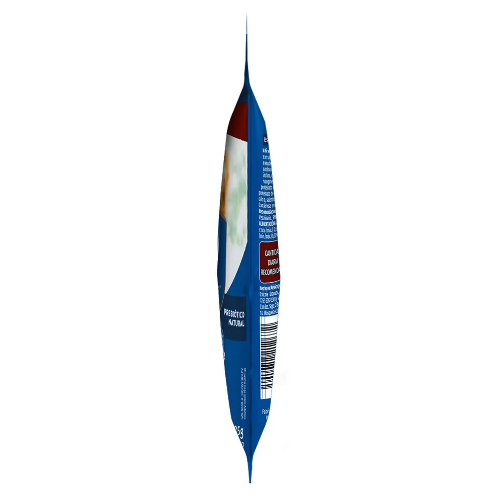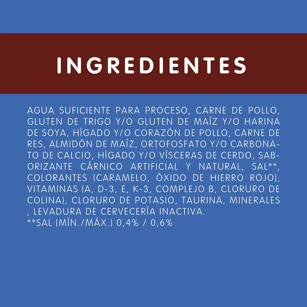 Agua suficiente para proceso, gluten de trigo y/o harina de soya y/o harina de menudencias de pollo, vísceras de pollo y/o vísceras de cerdo congeladas, carne de pollo congelada, carne de sardina congelada, carne de res congelada, almidón de maíz, glicerina, dextrosa y/o xilosa, fosfato bicálcico, sal*, inulina, cloruro de potasio, vitaminas (A, B1, B2, B3, B5, B6, B7, B9, B12, D3, E, K3), minerales [(sulfatos: zinc, hierro, manganeso, cobre), minerales de alta absorción/quelados (proteinato de zinc y/o complejo de zinc-glicina, proteinato de hierro y/o complejo de hierro-glicina, proteinato de manganeso y/o complejo de manganeso-glicina, proteinato de cobre y/o complejo de cobre-glicina, proteinato de selenio y/o complejo de selenio-glicina), yodato de calcio, selenito de sodio], carbonato de calcio, taurina, cloruro de colina. *Sal (mín./máx.) 0.1% / 0.6%.