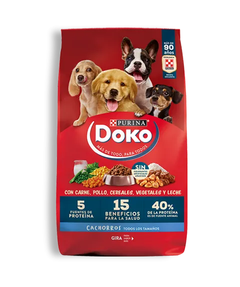 Alimento seco para cachorros de todos los tamaños DOKO® con Carne, Pollo, Cereales, Vegetales y Leche. Un alimento 100% completo y balanceado con 5 fuentes de proteína, de las cuales 40% es de fuente animal. Un solo producto con 15 beneficios que ayudan a la salud, como músculos fuertes, piel sana, pelaje saludable, y más. Ahora sin colorantes artificiales añadidos.