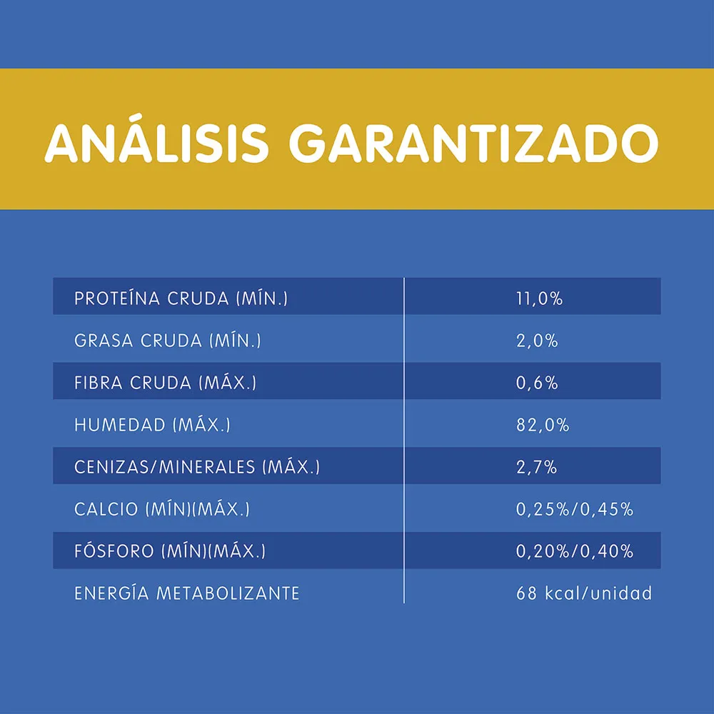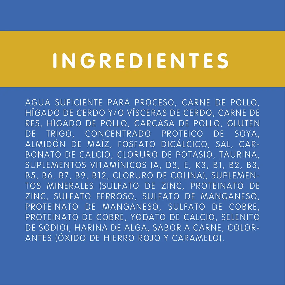 Agua suficiente para proceso, gluten de trigo y/o harina de soya y/o harina de menudencias de pollo, carne de pollo congelada, vísceras de pollo y/o vísceras de cerdo congeladas, carne de pescado congelada, almidón de maíz, inulina, glicina, dextrosa y/o xilosa, sal*, fosfato bicálcico, carbonato de calcio, vitaminas (A, B1, B2, B3, B5, B6, B7, B9, B12, D3, E, K3), cloruro de potasio, cloruro de colina, minerales [(sulfatos: zinc, hierro, manganeso, cobre), minerales de alta absorción/quelados (proteinato de zinc y/o complejo de zinc glicina, proteinato de hierro y/o complejo de hierro glicina, proteinato de manganeso y/o complejo de manganeso glicina, proteinato de cobre y/o complejo de cobre glicina, proteinato de selenio y/o complejo de selenio glicina), yodato de calcio, selenito de sodio], taurina. *Sal (mín./máx.) 0.1% / 0.6%.